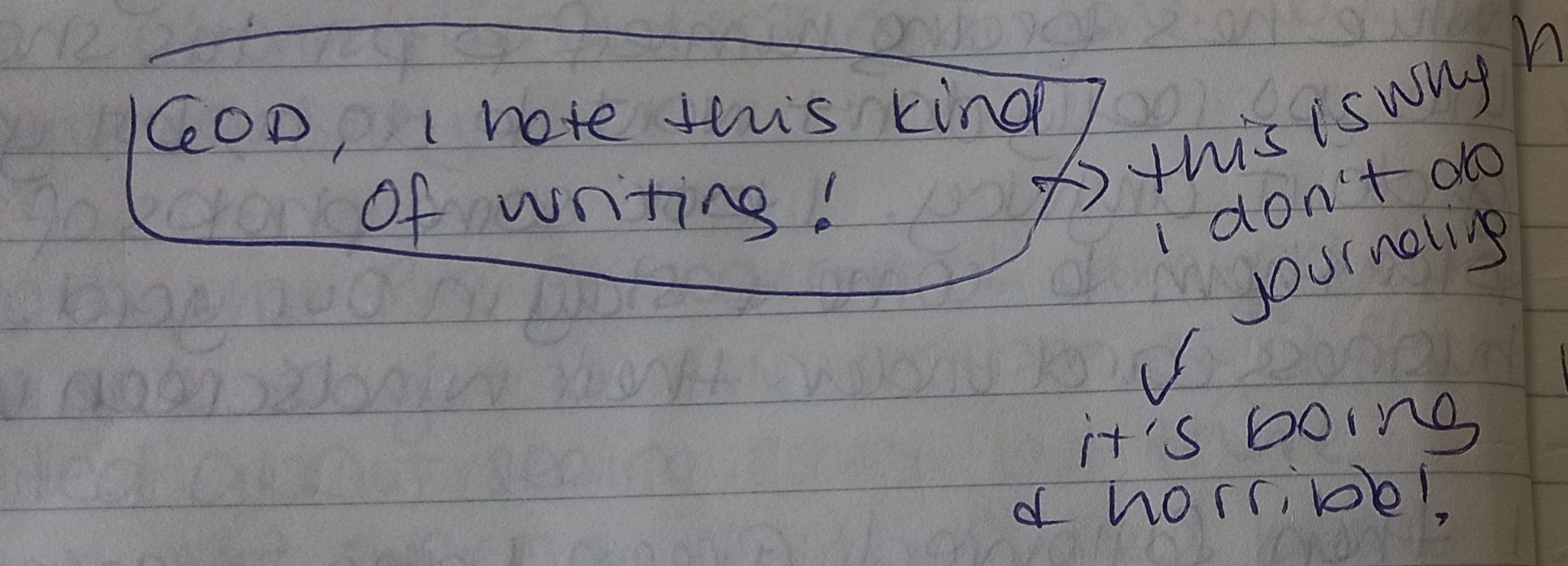 I write all this stuff in a journal while I’m doing an adventure so that I can remember it properly later on. I really, really hate doing this! It’s the most annoying form of wrting for me and I have to write very fast so I can out-write the feeling of the approaching tantrum of I DON’T WANNA!! This is what happens when I write in a journal: