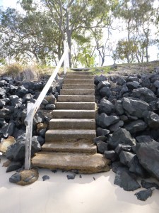 Cement stairs from foreshore onto beach. Constructed by the council. If these weren’t here we’d be clambering over rocks. Things have changed since the seawall was constructed. My fault? No.