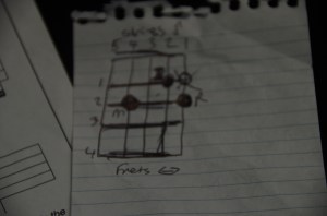 I had no idea how to play a cord, so I had to draw the way it looks so that I could understand it. It’s so bloody confusing because I couldn’t find instructions anywhere on which finger goes on which string on which fret, so I just had to work it out myself. I don’t know if this is “right”, but I’m kind of assuming that there must be no “right” otherwise it would be more obvious.